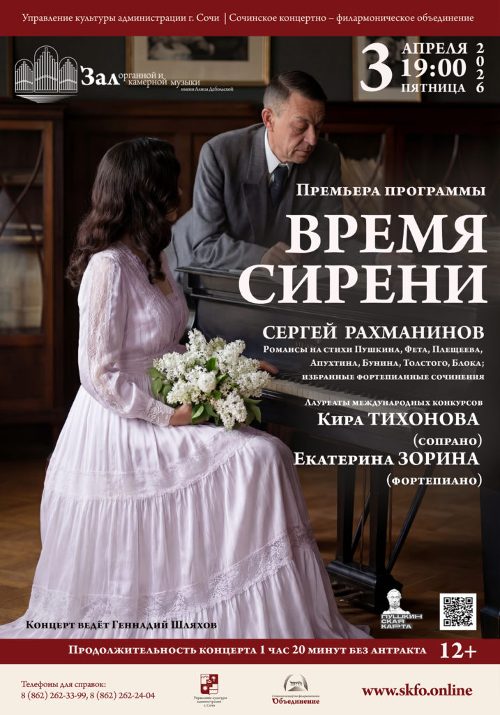 Программа «Времени сирени» представит слушателям знаменитую «Сирень» на стихи Е. Бекетовой, а также романсы на стихи А. Пушкина, А. Толстого, Ф. Тютчева, А. Плещеева, А. Фета, А. Блока и других поэтов. Фортепианные пьесы Рахманинова гармонично дополнят программу вечера.
