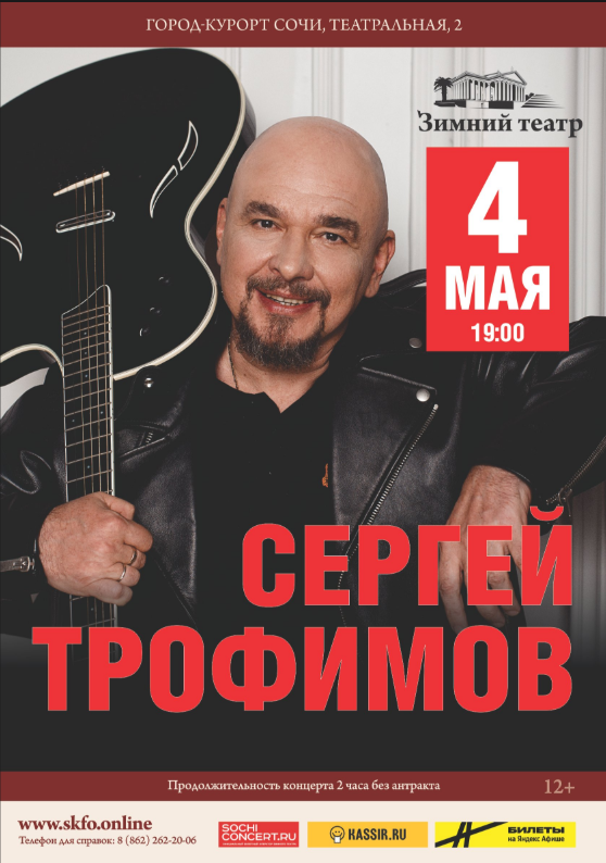 Приходите, провести вечер в теплой дружеской атмосфере под любимые хиты, которые уже давно стали народными, а артист избавит Вас от зимней депрессии, напомнив Вам о том, что «…точно растает лед и в озябший мир придет весна» и вновь будет «Ветер в голове», когда солнце согреет Вас в «Городе Сочи»