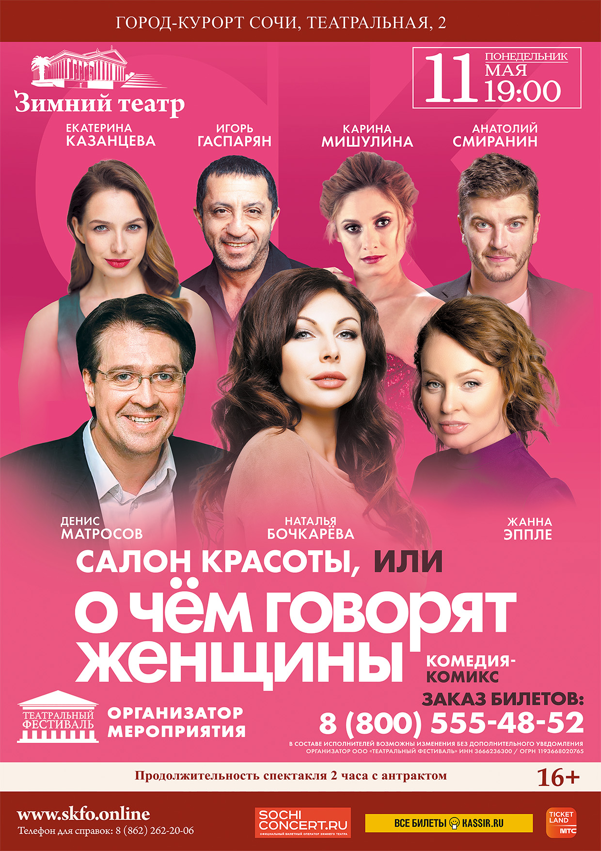Ошеломительная премьера московского спектакля «Салон красоты, или о чём говорят женщины»!Вы знали, что истинные женские откровения происходят в салоне красоты? Именно там решаются важные семейные вопросы, дамы делятся своими тайнами и переживаниями…